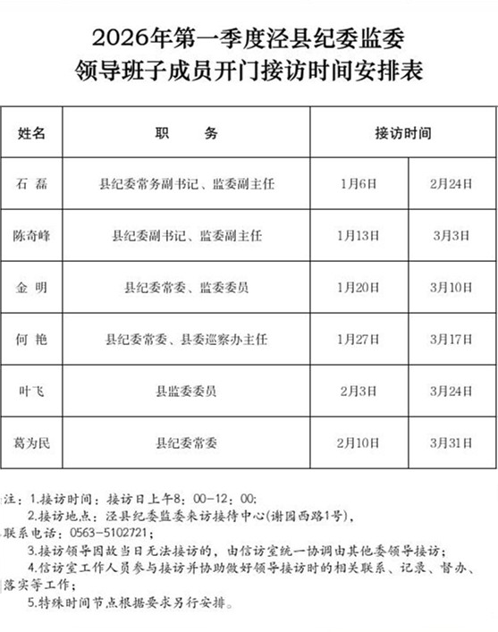 2026年第一季度泾县纪委监委领导班子成员开门接访时间安排表