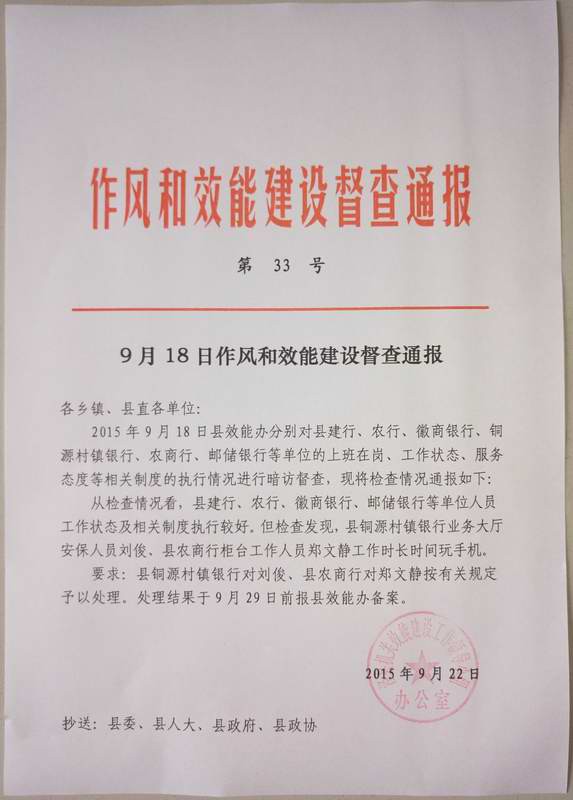 作风和效能建设督查通报(2015年第33期)